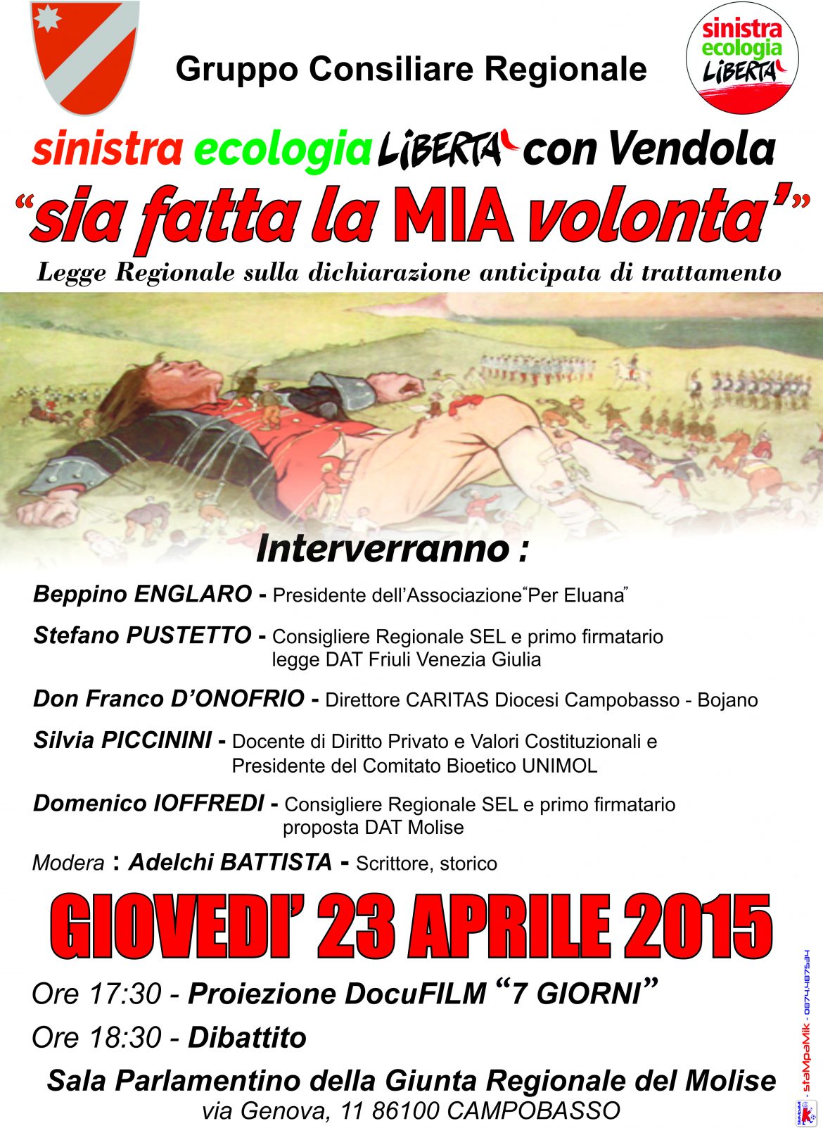 L’evento prevede la proiezione del docufilm ‘7 Giorni’. Al dibattito interverranno anche: Stefano Pustetto, consigliere regionale Sel e primo firmatario legge Dat Friuli Venezia Giulia; Don Franco D’Onofrio, direttore Caritas Diocesi Campobasso-Bojano; Silvia Piccinini, docente di Diritto Privato e Valori Costituzionali e presidente del Comitato Bioetico dell’Unimol; Domenico Ioffredi, consigliere regionale SEL e primo firmatario legge DAT Molise. A moderare l’incontro ci sarà lo scrittore Adelchi Battista.