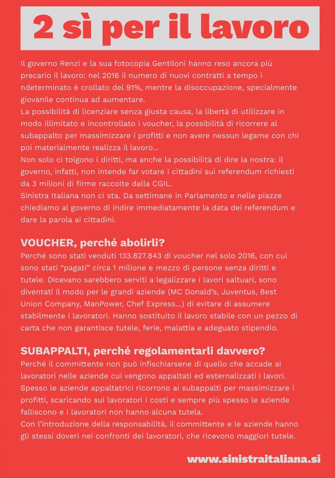 La direzione nazionale di Sinistra Italiana, convocata a Roma per sabato 4 marzo, parteciperà alla manifestazione in programma alle ore 12 davanti la sede del Ministero del Lavoro a sostegno dei Referendum sul Lavoro promossi dalla CGIL e sottoscritti da 3 milioni di cittadini italiani insieme alla proposta di legge d’iniziativa popolare istitutiva della “Carta Universale dei Diritti dei lavoratori e delle lavoratrici”.