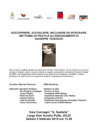 ‘Soccorrere, accogliere, includere ed integrare. Mettiamo in pratica gli insegnamenti di Giuseppe Tedeschi’: questo il titolo dell’iniziativa promossa a Jelsi dall’amministrazione comunale in collaborazione con associazione Giuseppe Tedeschi, Cooperativa Sociale Hayet, Pax Christi Molise, Cgil Molise, Libera e Anpi, sabato 2 febbraio alle 15,30 nella Sala Convegni ‘G. Santella’, in occasione del 43° anniversario dell’assassinio di Padre Giuseppe Tedeschi, morto in Argentina nel 1976.