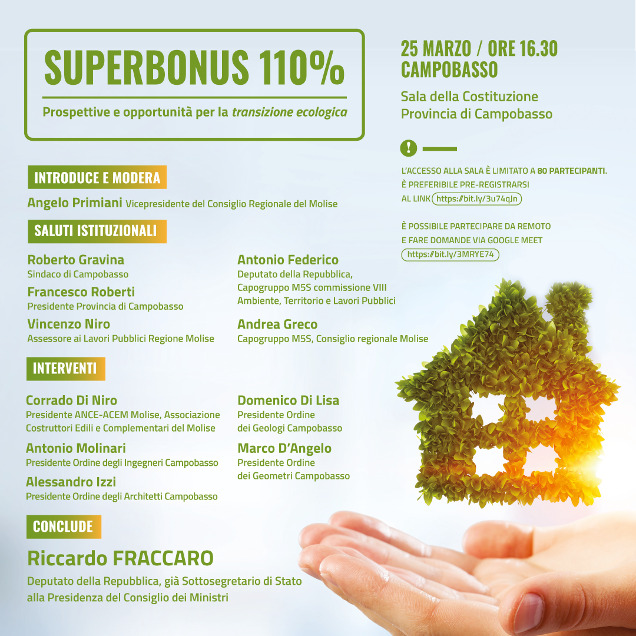 Le opportunità e le prospettive del Superbonus 110% per lo sviluppo del Molise, in ottica di transizione ecologica. Questo il tema al centro del dibattito organizzato per venerdì 25 marzo 2022, alle ore 16:30 nella sala della Costituzione della Provincia di Campobasso. Il MoVimento 5 Stelle Molise incontrerà i rappresentanti delle istituzioni, degli Ordini professionali e delle amministrazioni locali per fare il punto sulla misura che, dati alla mano, sta spingendo la ripresa economica del Paese.