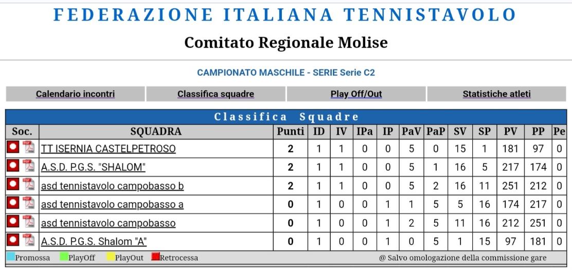 In serie C2 nel derby tutto campobassano tra Tennistavolo Campobasso e Tennistavolo Campobasso “B” ha prevalso la squadra “B” per 5 a 2; la PGS Shalom Petrella ha vinto contro la Tennistavolo Campobasso “A” per 5 a 1; la TT Isernia Castelpetroso ha vinto per 5 a 0 contro la PGS Shalom “A”.