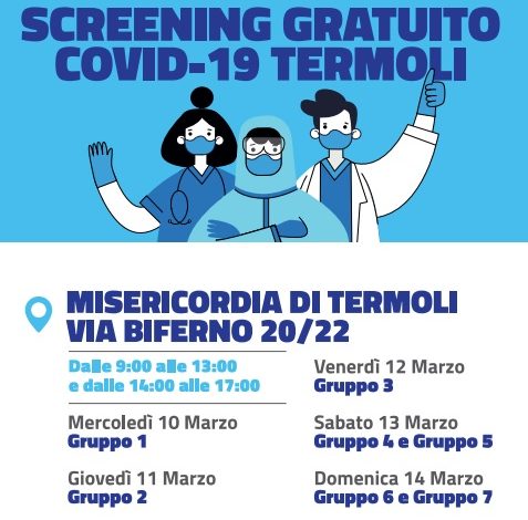 È stata stilata la prima parte del calendario per lo screening epidemiologico gratuito voluto dall’amministrazione comunale di Termoli. Per sottoporsi al tampone antigenico, nei giorni indicati, bisognerà recarsi presso la sede della Misericordia di Termoli, in via Biferno 22, dalle ore 9 alle 13 e dalle 14 alle 17.