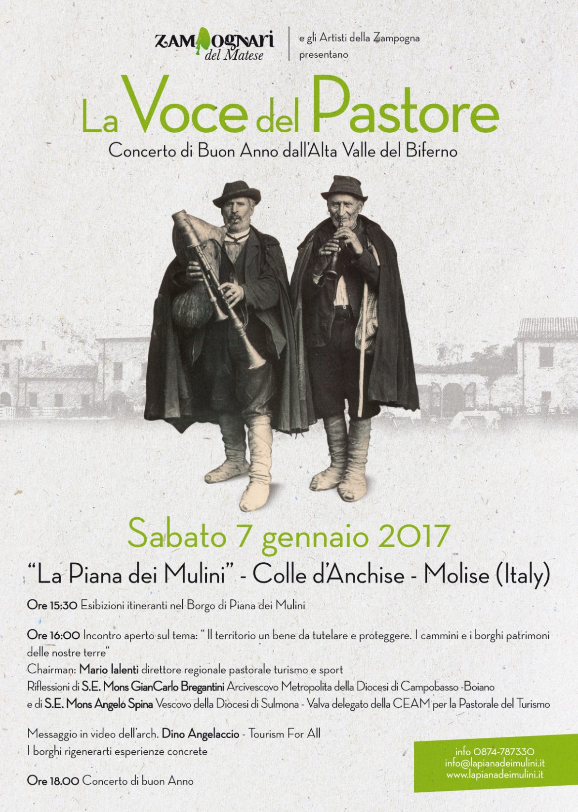 Sabato 7 gennaio 2017 alle ore 15:30 il convegno avrà luogo presso “La Piana dei Mulini” a Colle d’Anchise (CB)-Molise nell’ambito dell’annuale incontro “La Voce del Pastore” promosso dall’associazione Gli zampognari del Molise che vede radunare gli esecutori dell’antico strumento aerofono dell’area montana del Matese e delle Mainarde simbolo etnico e iconografico della tradizione popolare e religiosa.