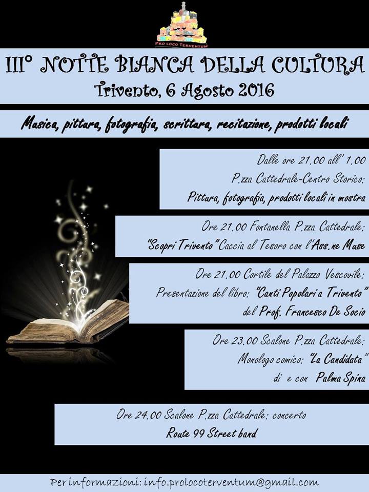 Si comincia alle ore 21 di sabato 6 agosto 2016 nel cortile del Palazzo Vescovile con la presentazione del libro “Canti popolari a Trivento”, scritto dal professor De Socio, una raccolta di canti popolari triventini per la quale hanno collaborato tanti triventini che hanno messo a disposizione del Prof. De Socio il materiale in loro possesso e le proprie conoscenze.
