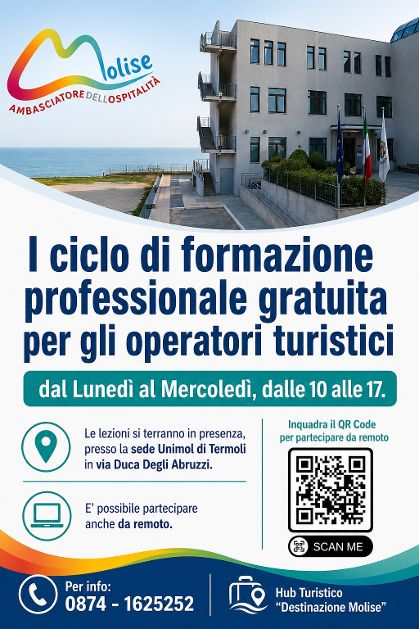 Si ricorda che il ciclo completo è di 167 ore e che le lezioni si terranno sempre dal lunedì al mercoledì. Si può partecipare in presenza (presso la sede Unimol di Termoli) o da remoto collegandosi al seguente link (valido per tutte le lezioni in programma a maggio):