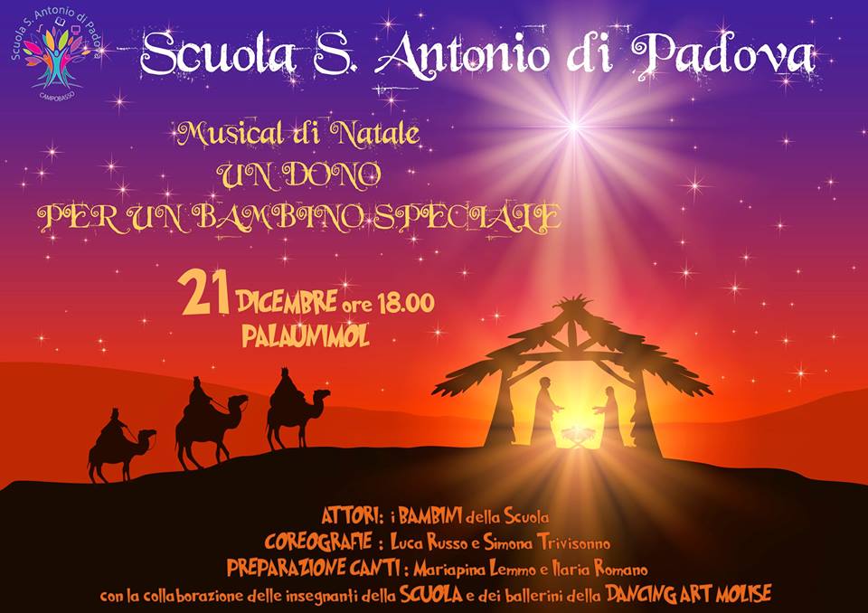 La scuola dell’Infanzia Sant’Antonio di Padova giovedì 21 dicembre 2017 alle ore 18 sarà impegnata al PalaUnimol di Campobasso, per il musical di Natale ‘Un dono per un bambino speciale’. Protagonisti dell’iniziativa saranno tutti i bambini dell’istituto.