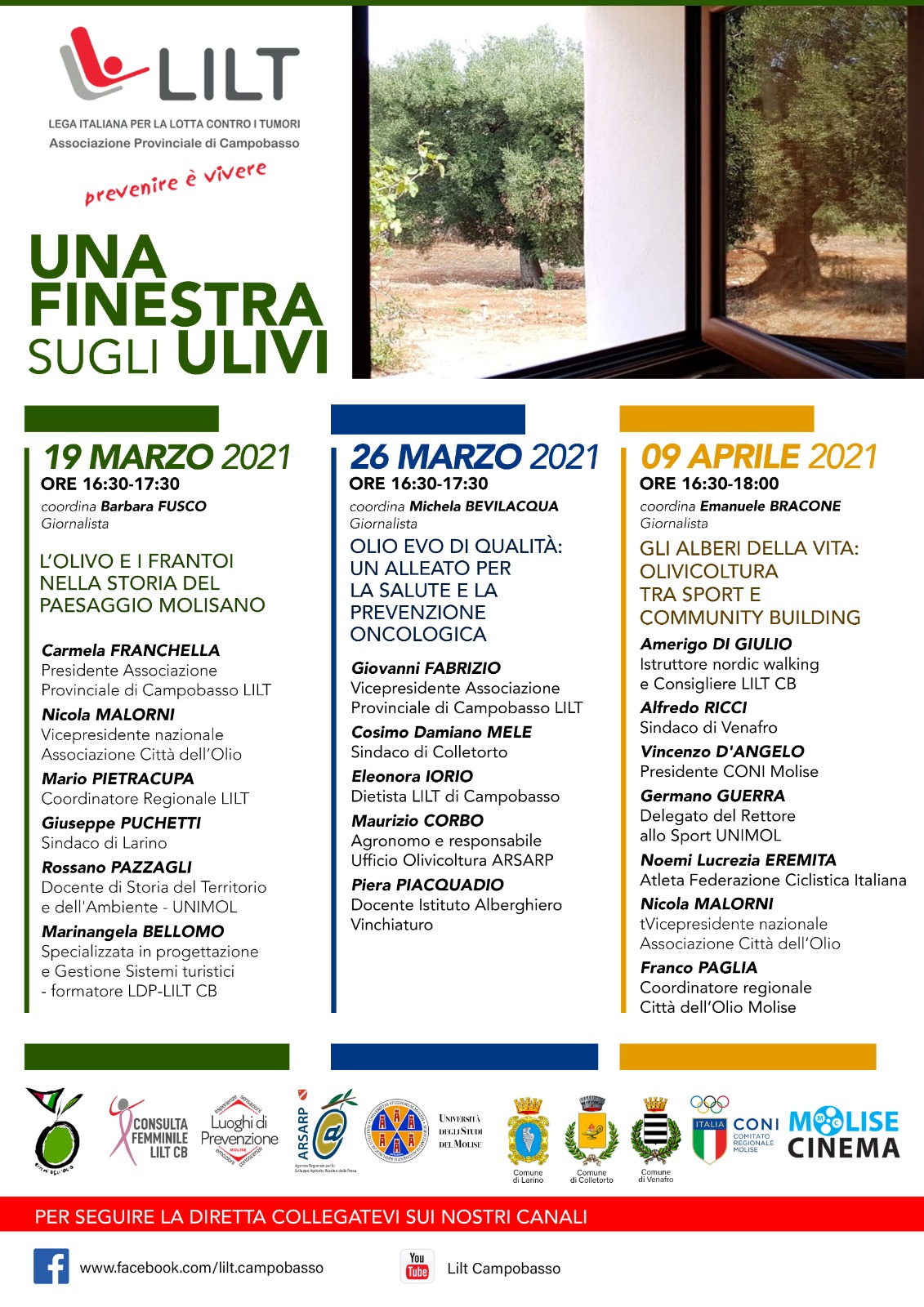 “Una finestra sugli ulivi” racchiude tre diversi incontri che si terranno online e che vedranno alternarsi varie figure professionali, amministratori e sportivi sull’importanza di utilizzare un olio extravergine di oliva di qualità nella prevenzione oncologica e nella promozione di corretti stili di vita tra cui l’alimentazione e l’attività fisica, valorizzando le tradizioni e la cultura del territorio molisano attraverso la storia di ulivi e frantoi.