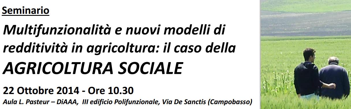 Domani, mercoledì 22 ottobre 2014, alle ore 10.30 nell’aula “Louis Pasteur” del Dipartimento Agricoltura Ambiente e Alimenti dell’Università del Molise (III Edificio Polifunzionale via de Sanctis a Campobasso) si terrà un seminario sull’ Agricoltura sociale.