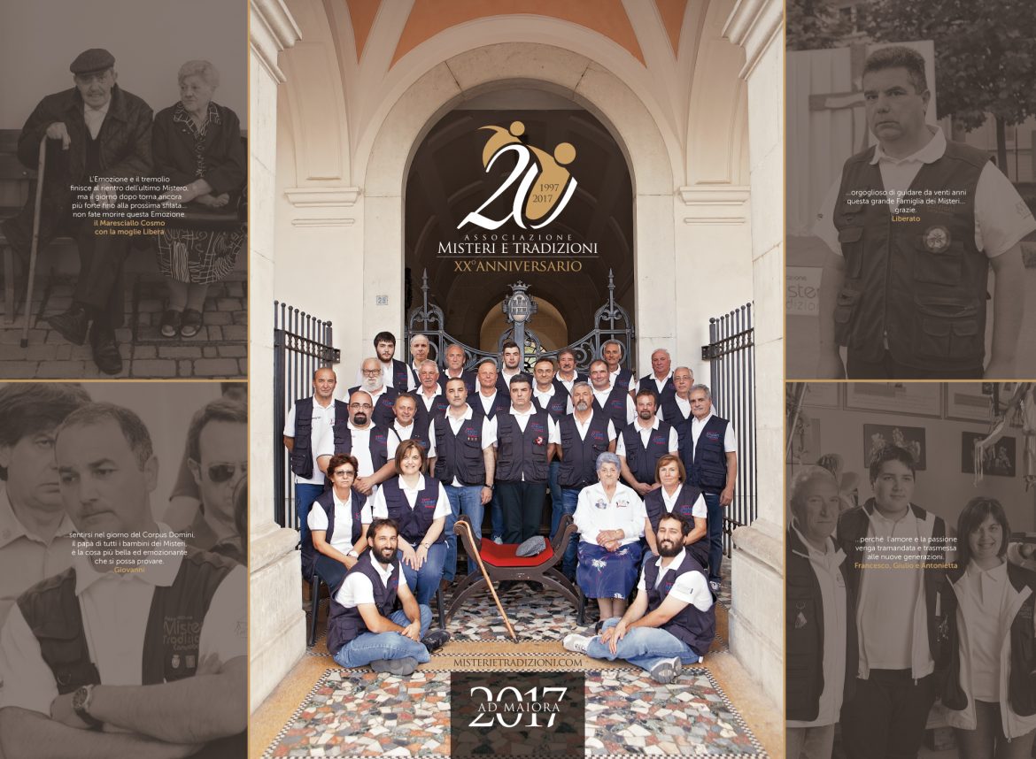 Ed eccolo qui il calendario 2017: i Misteri, immortalati dagli scatti di Roberto de Rensis, esaltandone la bellezza della scenicità creata dal Di Zinno nell’esaltazione degli episodi biblici, tanto da farli diventare scene viventi dell’agiografia e mariologia cristiana. Stampato in 4.000 copie numerate, un lavoro di pregio artistico che festeggia a pieno titolo il ventesimo anno di vita.