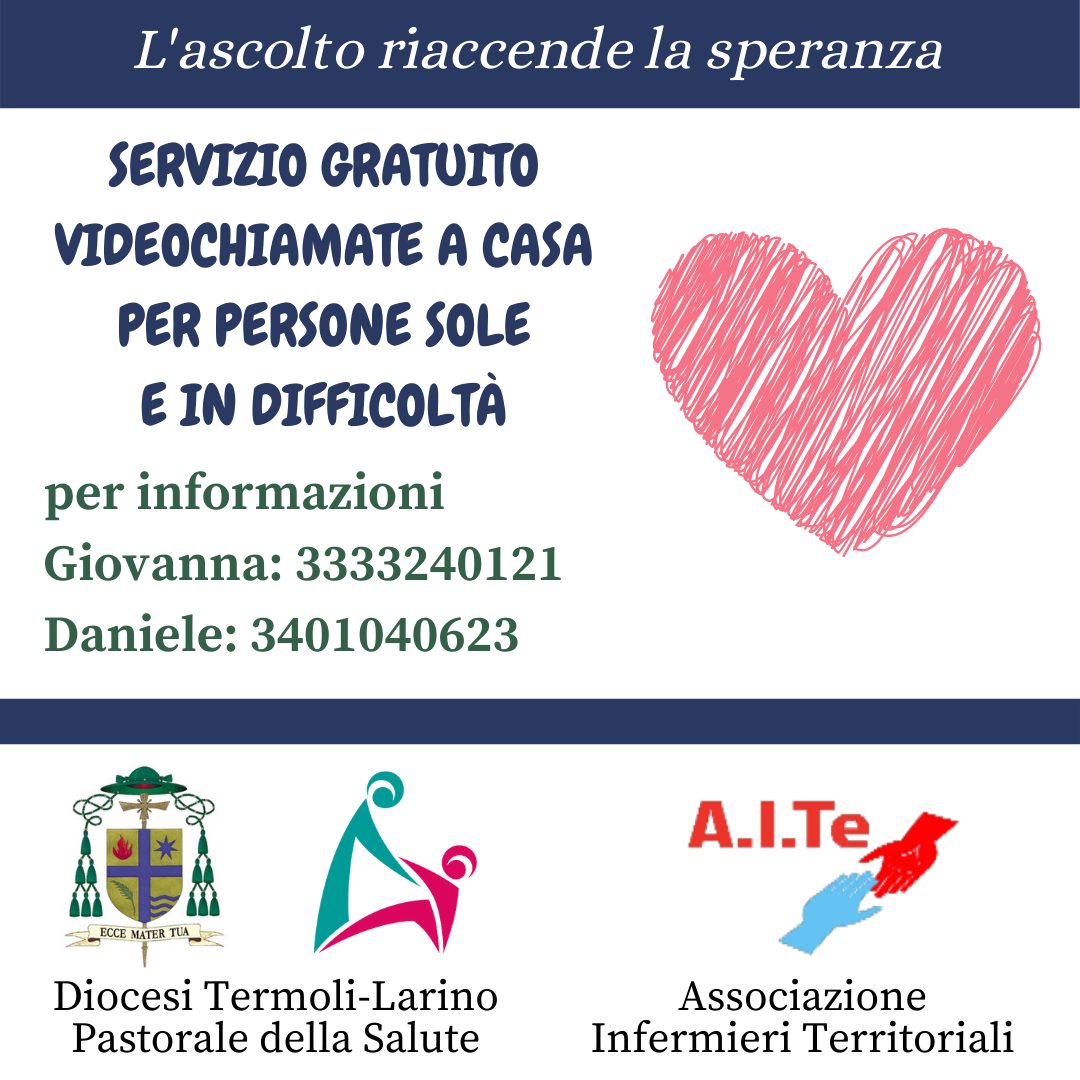 Un servizio gratuito di ascolto e di vicinanza per condividere con le persone sole o in difficoltà momenti di serenità in questi giorni di festa condizionati dalle restrizioni dovute all’emergenza sanitaria in corso. La diocesi di Termoli-Larino, attraverso la Consulta per la Pastorale per la Salute e in collaborazione con l’Aite (Associazione infermieri territoriali) ha attivato un servizio di contatto telefonico e videochiamate a casa dedicato alle persone sole o che non hanno un telefonino connesso a internet e altri disagi.