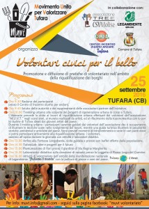 Promuovere e diffondere pratiche di volontariato nell’ambito della riqualificazione dei borghi. Sono questi gli obiettivi dell’iniziativa “Volontari civici per il bello”, in programma domenica prossima – 25 settembre – dalle ore 9,30 a Tufara.