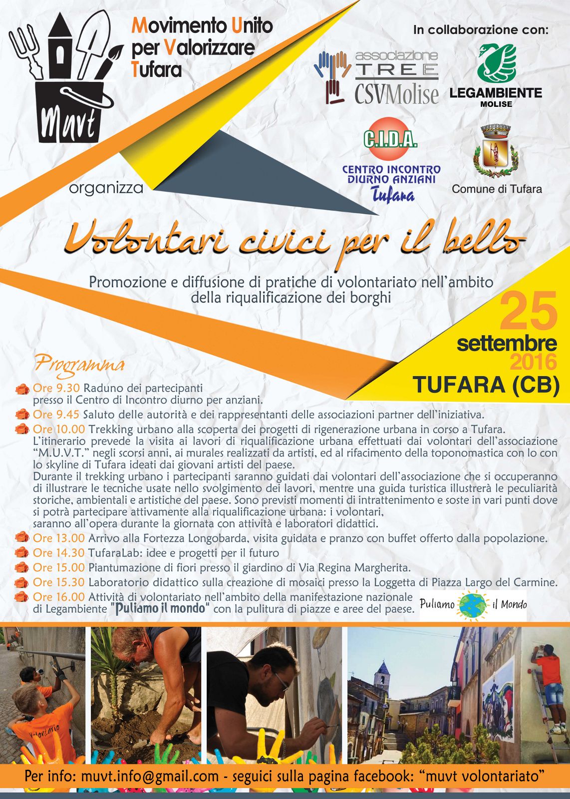 Le attività che l’Associazione sta portando avanti sono quelle del rifacimento di aree urbane, in particolare della risistemazione delle piazze e dei giardini, le attività di Street–Art con la realizzazione di mosaici e di murales nel centro storico del paese ed infine la realizzazione con segnaletica di una rete di itinerari escursionistici che collegano il paese con gli altri centri limitrofi. Il programma della giornata, dopo un saluto dei rappresentanti delle associazioni partner dell’iniziativa (CVS Molise, Legambiente Molise, Comune di Tufara, Centro Diurno Anziani Tufara), prevede la visita ai lavori di riqualificazione urbana effettuati dai volontari dell’associazione negli scorsi anni, ai murales realizzati da artisti, ed al rifacimento della toponomastica con lo con lo skyline di Tufara ideato dai giovani artisti del paese. Durante il trekking urbano i partecipanti saranno guidati dai volontari dell’associazione che si occuperanno di illustrare le tecniche usate nello svolgimento dei lavori, mentre una guida turistica illustrerà le peculiarità storiche, ambientali e artistiche del comune.