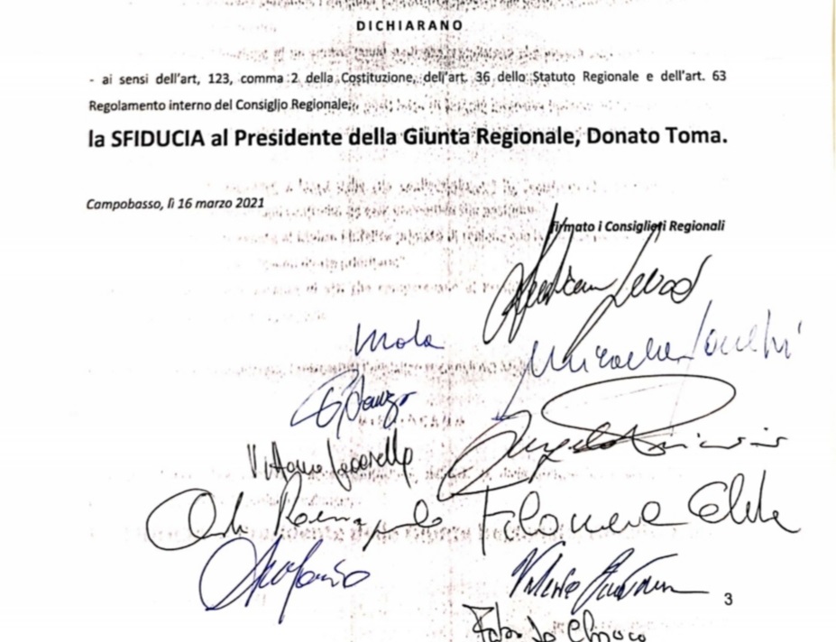 Le minoranze e quindi, i consiglieri del Partito Democratico e del movimento Cinque Stelle hanno presentato una mozione di sfiducia al presidente Toma. Ai sei esponenti di opposizione si sono aggiunte anche le firme dell’ex presidente Iorio e delle consigliere Calenda e Romagnuolo.