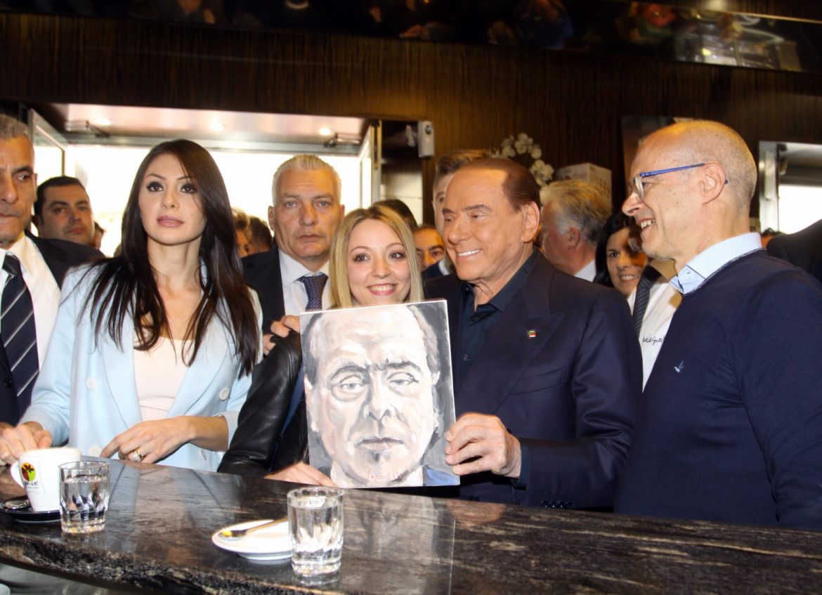 Una studentessa dona a Berlusconi una tela con un suo ritratto, mentre lo stesso si intrattiene a conversare con una pensionata e sostenitrice del cavaliere. L’occasione giusta per illustrare la voglia di un nuovo decreto pensioni, un provvedimento da mettere sul tavolo del nuovo Governo, se mai si farà. “Ho pronto un decreto per portare tutte le pensioni a mille euro. Lo facemmo già quando portammo le pensioni a un milione di lire, poi – dice Berlusconi con un po’ di rammarico – gli italiani hanno votato diversamente”.