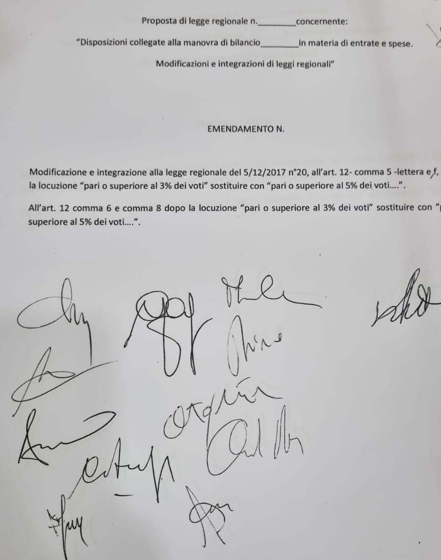 L’emendamento passato con i soli voti del centrodestra, con l’astensione del Movimento Cinque Stelle che è uscito dall’Aula e il voto contrario del PD, alza la soglia di sbarramento per i partiti dal 3 al 5%.