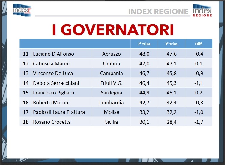 Peggio del numero uno del Molise solo il presidente della Sicilia, Rosario Crocetta. È, invece, il presidente della Puglia, Michele Emiliano, il governatore “più gradito” a cui fa seguito il numero uno del Veneto, Luca Zaia.
