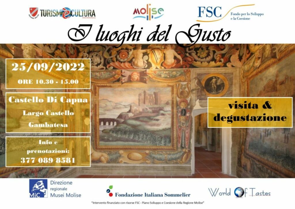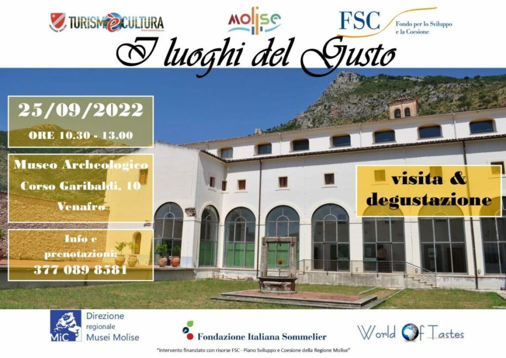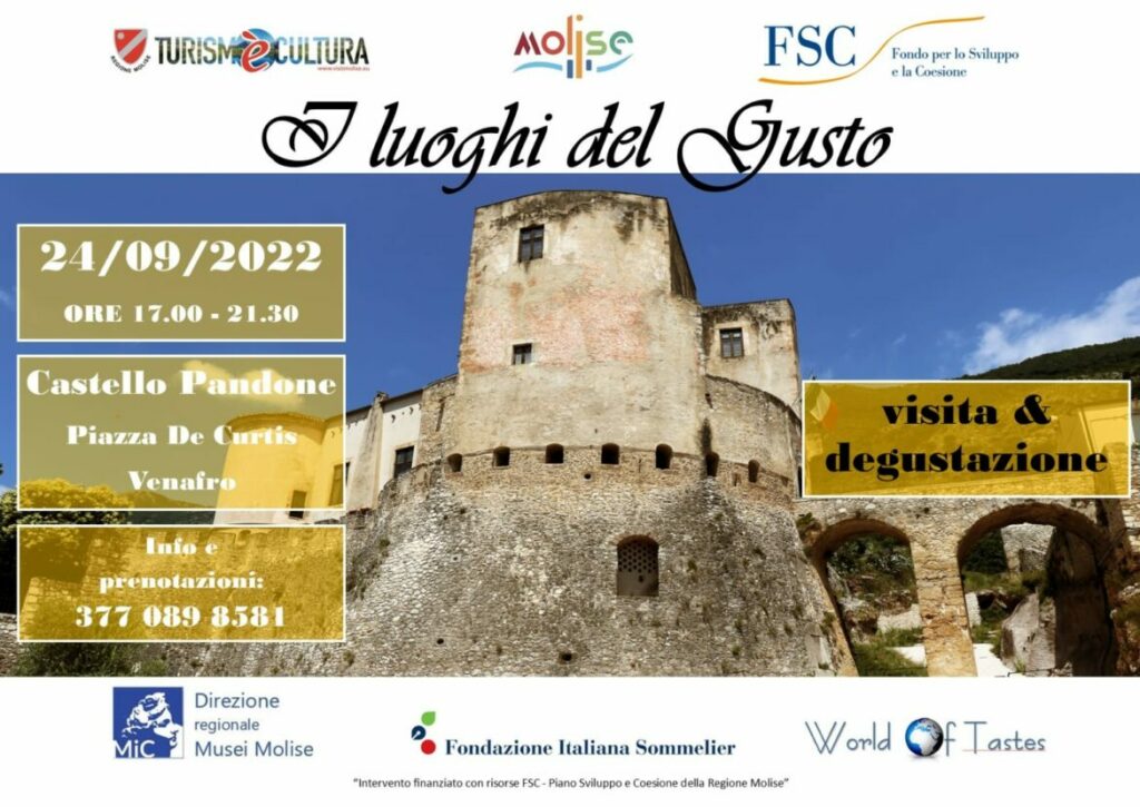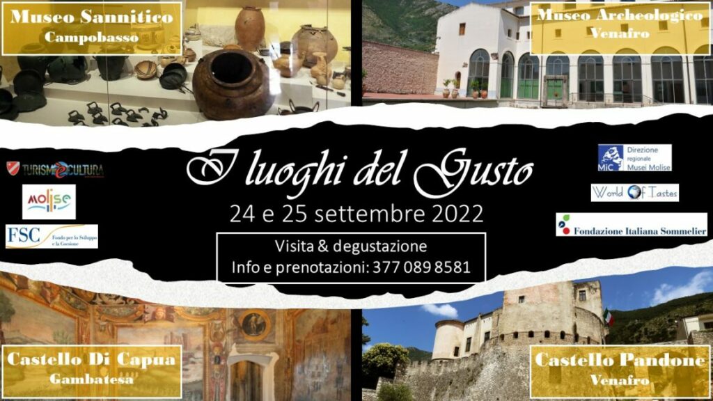 Con l’iniziativa ‘I luoghi del Gusto’ la Fondazione Italiana Sommelier, sabato 24 e domenica 25 settembre 2022 sarà, infatti, presente al Museo Sannitico di Campobasso, al Castello di Capua di Gambatesa, al Castello Pandone e al Museo Archeologico di Venafro per consentire di accompagnare le visite guidate a degustazioni enogastronomiche che avranno come protagonisti i prodotti del territorio.