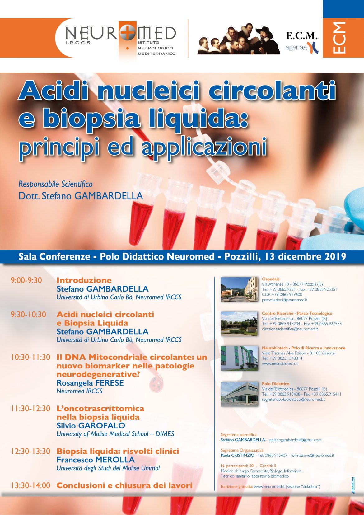 È questo l’argomento al centro del corso di Educazione Continua in Medicina (ECM) “Acidi nucleici circolanti e biopsia liquida: principi ed applicazioni”, che si svolgerà domani, venerdì 13 dicembre, dalle ore 9 alle 14, nella sala convegni Auditorium Marc Verstraete dell’I.R.C.C.S. Neuromed di Pozzilli. Nel corso del meeting, di cui è Responsabile scientifico Stefano Gambardella, responsabile del Laboratorio di Genetica molecolare Neuromed, saranno esposti i più recenti sviluppi per quanto riguarda la possibilità di individuare e studiare, attraverso un semplice prelievo di sangue, il DNA proveniente da cellule tumorali.