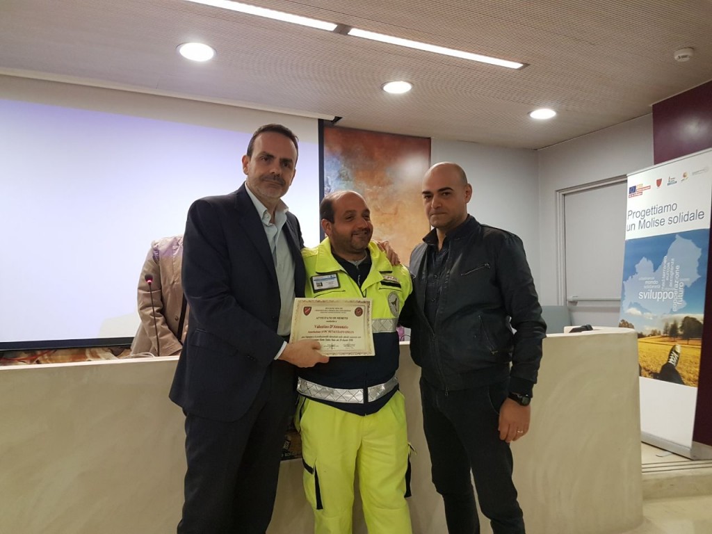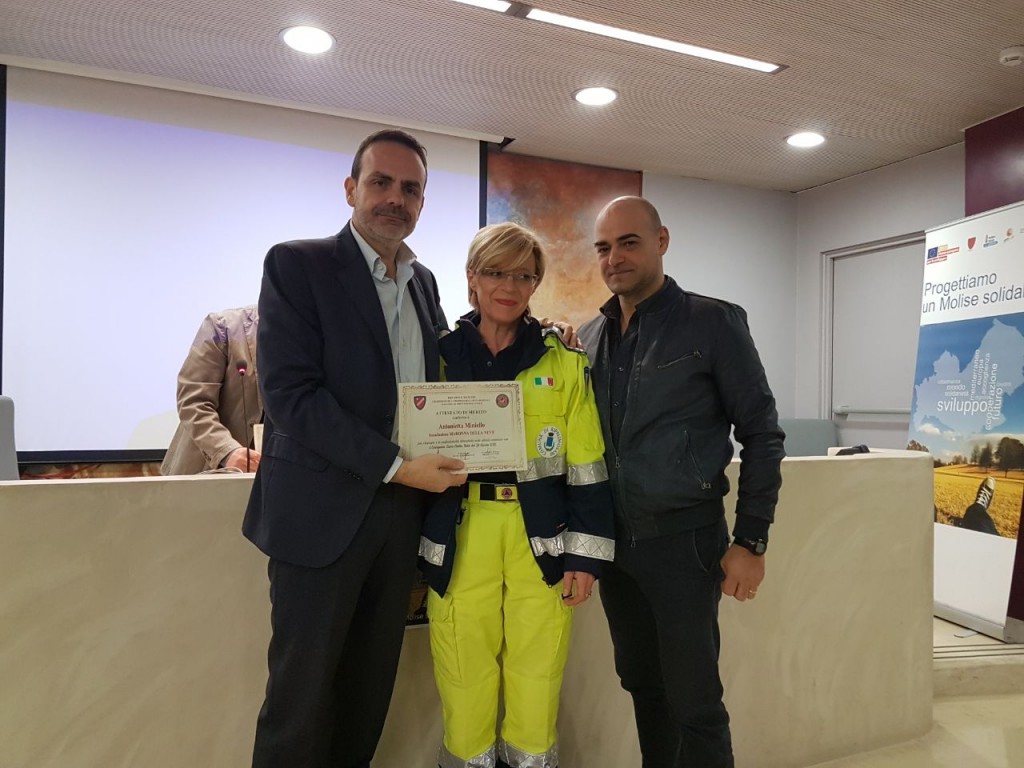 La Regione Molise ha deciso di riconoscere i meriti ai duecento volontari, che sono stati impegnati nella fase post-terremoto del Centro Italia, consegnando loro un attestato di merito, come affermato dal consigliere regionale, con delega alla Protezione Civile, Salvatore Ciocca, “col quale abbiamo deciso di lasciare un segno tangibile a chi ha prestato il proprio tempo e la propria professionalità, in soccorso a chi, in un attimo, ha perso tutto ciò che aveva costruito con i sacrifici di una vita”.