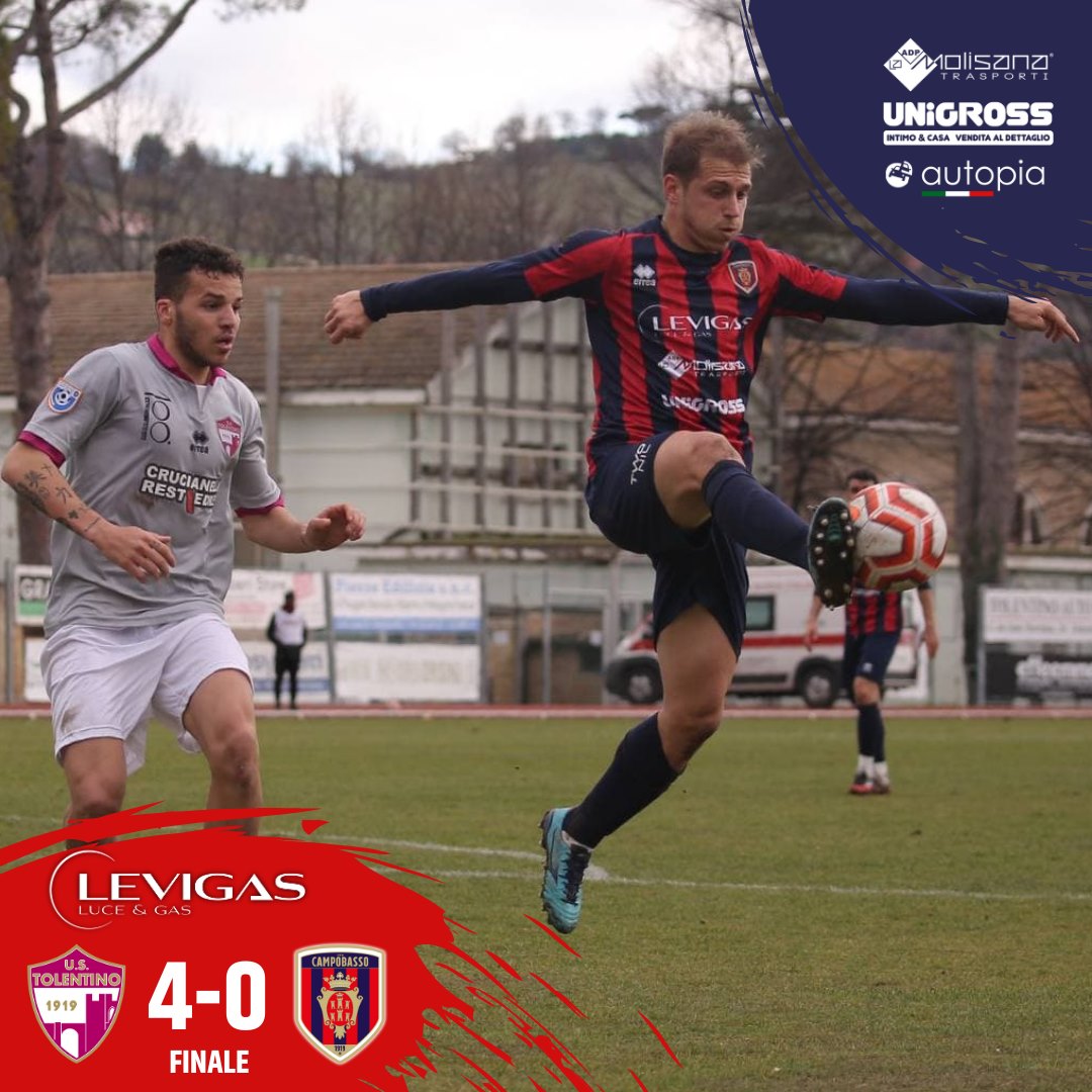 La ripresa si gioca sulla falsariga del primo tempo. Il Campobasso è in giornata no. Il Tolentino cala il poker all’84’, quando Conti pennella per la testa di Minella, la cui incornata vale il 4-0 finale.