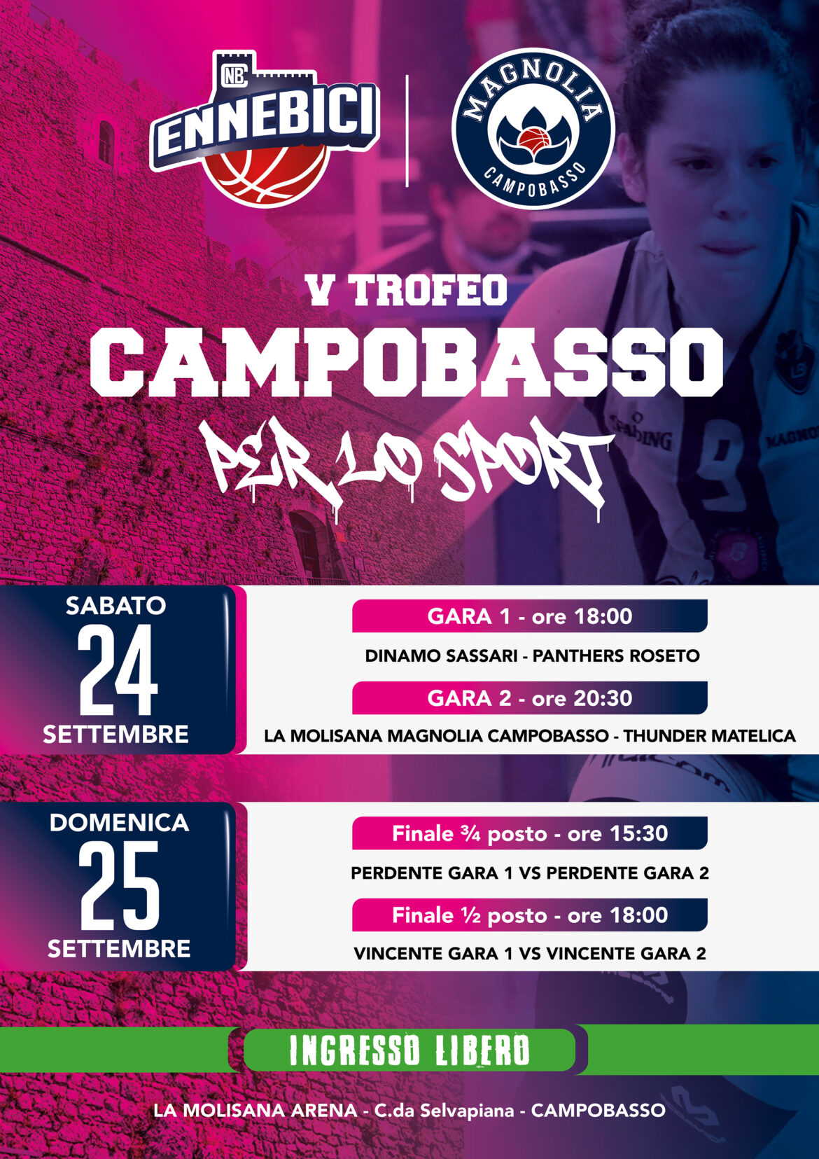 La Molisana Magnolia Campobasso si tuffa sulla quinta edizione del torneo ‘Campobasso per lo sport’, la kermesse curata dalla Ennebici in programma tra sabato e domenica nello scenario dell’impianto amico, dove, di concerto, il team organizzatore e quello dei #fioridacciaio hanno definito l’ingresso libero per avvicinare un po’ tutti gli sportivi (molisani e non) a vedere da vicino le emozioni della pallacanestro in rosa.