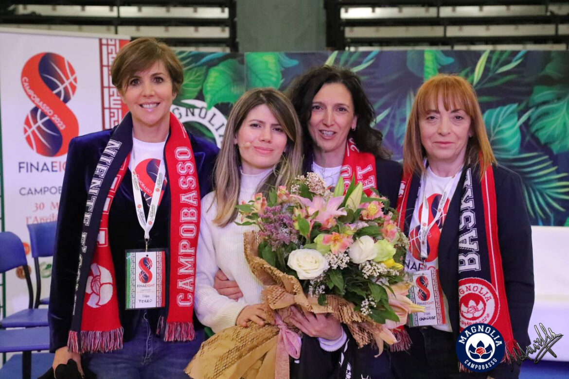 OMAGGI E CLAIM Ognuna di loro, al termine, è stata omaggiata di un bouquet dalle giocatrici del vivaio campobassano e, al termine, la presidente Antonella Palmieri ha raggiunto il centro della scena per donare un prezioso omaggio floreale ed una maglietta speciale – di quelle con cui le campobassane giocheranno la rassegna tricolare – alla stessa Sanam con il numero uno ed il cognome Shirvani sulle spalle.