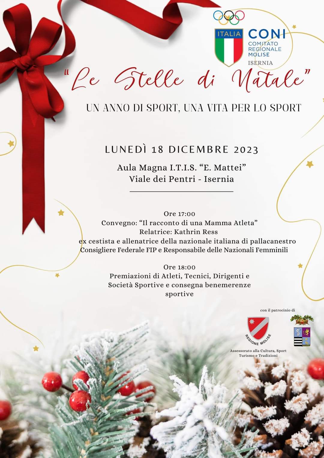 Le Stelle di Natale, “Un anno di sport, una vita per lo sport”. Il consueto evento del CONI Isernia è in programma oggi, lunedì 18 dicembre 2023, a partire dalle ore 17, nell’Aula Magna ITIS ‘Mattei’ di Isernia.