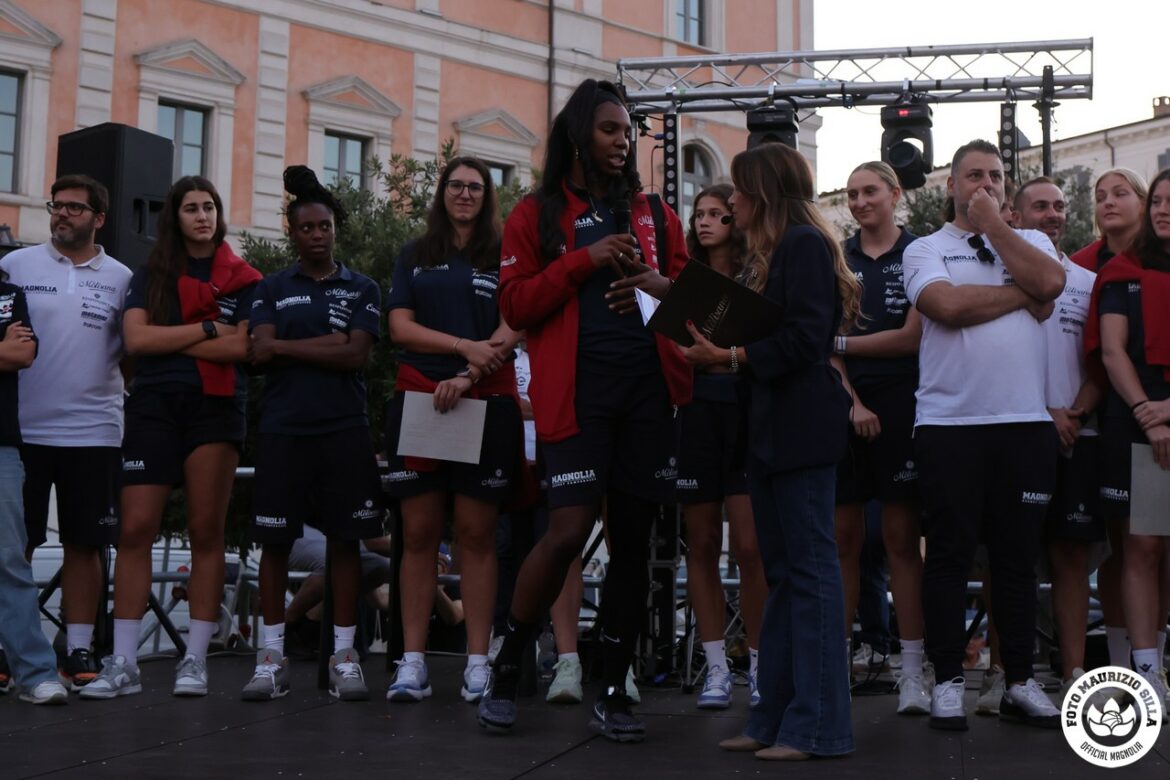 CUORE DELL’EVENTO In una piazza sempre più gremita dai tifosi rossoblù, ma anche da tanti curiosi che si sono avvicinati all’evento, è stato poi il turno della presentazione delle giocatrici che compongono il roster della prima squadra, dello staff tecnico, di quello medico, di quello dirigenziale a supporto, nonché dei settori tecnici delle giovanili femminili, delle corrispettive formazioni maschili e del minibasket.