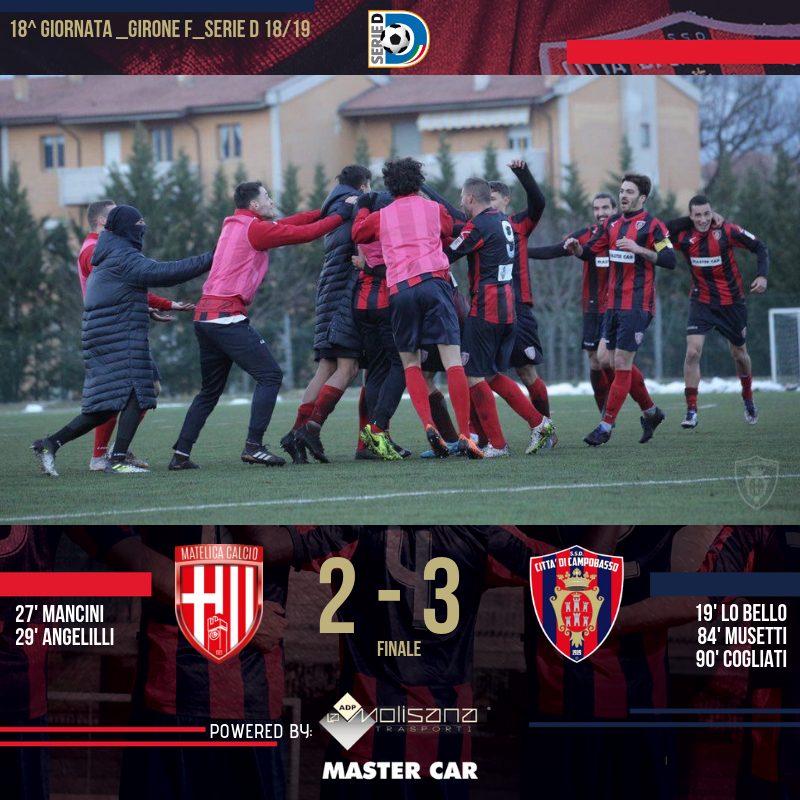 Il Campobasso, al cardiopalma, espugna il campo della capolista Matelica. Lupi in vantaggio con Lo Bello, marchigiani che ribaltano in due minuti. In zona Cesarini le reti di Musetti e Cogliati, che mandano in paradiso i rossoblù di Bagatti. Tre gli espulsi: Dorato, Lo Bello e De Santis.
