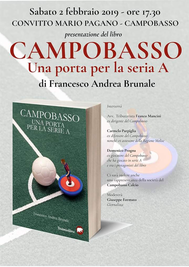 ‘Campobasso. Una porta per la serie A’ è il titolo dell’opera prima dell’avvocato e giornalista Francesco Andrea Brunale. Il libro, edito da Bertoni Editore, racconta le storie di undici calciatori che, passati per Campobasso, in epoca diverse, hanno calcato il massimo campionato calcistico nazionale. Quello dei sogni di ogni bambini.