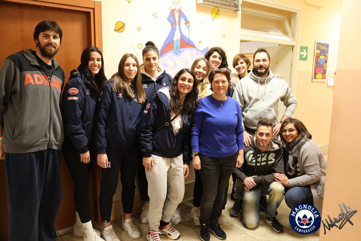POMERIGGIO MEMORABILE Guidato da Rossella Ferro, direttore generale del club, un gruppo di sei giocatrici della Magnolia Campobasso – Giorgia Amatori, Emilia Bove, la greca Parthena Chrysanthidou, l’argentina Federica Del Bosco, la croata Mia Mašić e Rachele Porcu – ha dato seguito al grande cuore del pubblico rossoblù manifestatosi, lo scorso 28 dicembre, in occasione della gara con il Ponte Buggianese, appuntamento di ‘Teddy Bear Toss’: il lancio dei peluche al primo canestro di contesa, nella circostanza realizzato da Emilia Bove.
