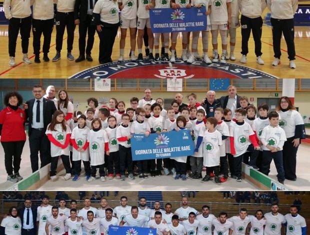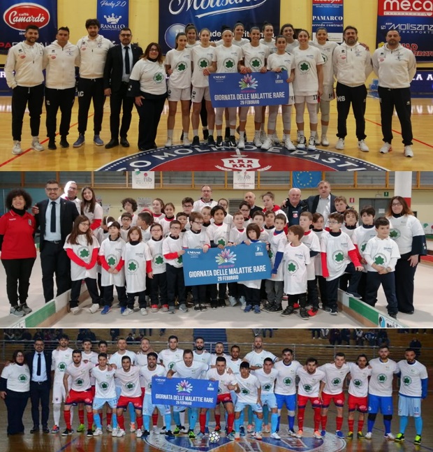 I giovanissimi atleti di una gara di bocce giovanile, organizzata dalla Bocciofila Avis Campobasso, i giocatori della partita Cln Cus Molise e Atletico Cassano (calcio a 5 serie A2) e le giocatrici della Magnolia Campobasso nel vittorioso match contro il Jolly Livorno (pallacanestro femminile serie A2) sono scesi in campo con le magliette dell’ANPPI e la bandiera di ‘Uniamo’ della Giornata Mondiale delle Malattie Rare.
