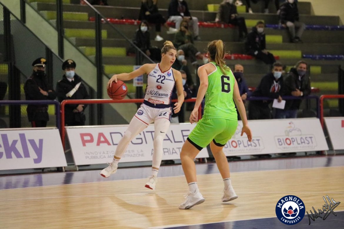 La Molisana Magnolia Campobasso infila il secondo successo consecutivo e lo fa, tra le mura amiche dell’Arena, a spese di un Broni che mostra una granitica costanza, ma deve arrendersi di fronte ai colpi di una Gorini cecchino dall’arco dei tre punti e di una Ostarello da doppia doppia (17 punti e 18 rimbalzi per un totale di 28 di valutazione e 25 di plus-minus).