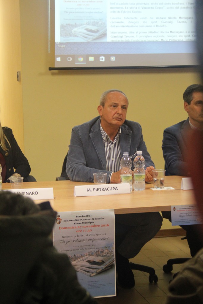 L’incontro pubblico, organizzato dall’amministrazione comunale bonefrana, ha visto la partecipazione del giornalista e scrittore Giuseppe Formato, autore di “Grazie per questo momento. La storia di Vincenzo Cosco”, che ha moderato il dibattito, intervenendo sul tema, parlando dell’importanza del gioco leale che lo Special Wolf portava nello spogliatoio e su cui ha fondato tutta la sua carriera, e sottolineando quanto sia importante, in tal senso, il ruolo degli educatori nelle società sportive.