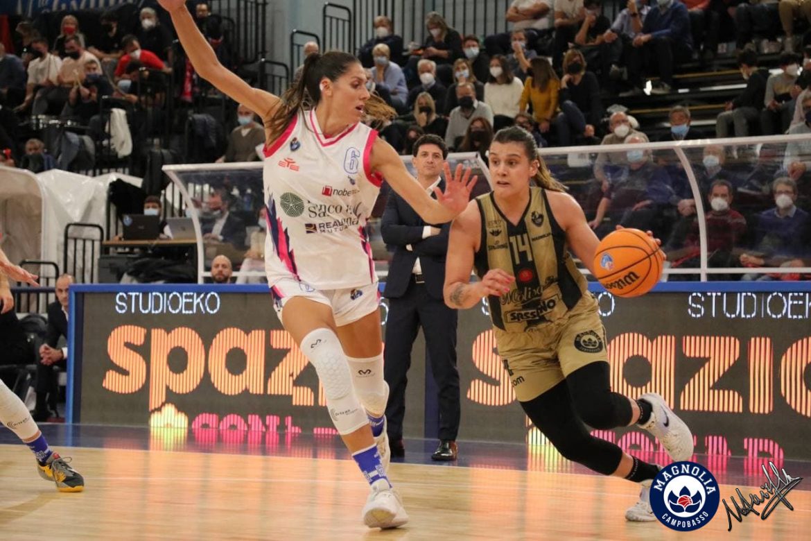 Intorno a Gray e Quiñonez, in avvio di secondo quarto, le magnolie scrivono un parziale di 8-0 che stravolge totalmente l’inerzia della contesa. La difesa rossoblù è pressante e, per Sassari (in particolare le due giocatrici statunitensi), la via del canestro inizia a farsi più stretta. Le magnolie arrivano a prendere due possessi pieni con Gray (31-25), poi un ulteriore allungo firmato Trimboli, Chagas e Togliani (con una tripla) portano il margine oltre la doppia cifra (38-27), indirizzando quarto e, al tempo stesso, contesa perché Premasunac ed un’altra tripla di Quiñonez spingono le rossoblù sino al +16 (46-30). È ancora Lucas dalla linea dei liberi a provare a tenere in partita le sarde all’altezza dell’intervallo lungo (46-33).