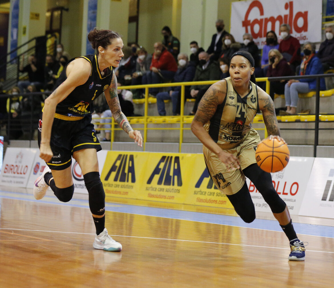EPILOGO INCERTO Gli ultimi dieci minuti ‘regolamentari’ si aprono con un ulteriore tentativo di sprint delle rossoblù con i due canestri in successione di Reshanda Gray (47-53) e, successivamente, quello di Togliani. La via del canestro, però, comincia a farsi improvvisamente ‘strettissima’ per le magnolie, che con Lawrence e Trimboli si approcciano allo sprint avanti di quattro (56-60). Parks con un 1/2 dalla lunetta mantiene un possesso di margine sul 58-61, ma la tripla di Mitchell manda le due squadre al supplementare, il secondo della stagione dopo quello a Costa Masnaga.