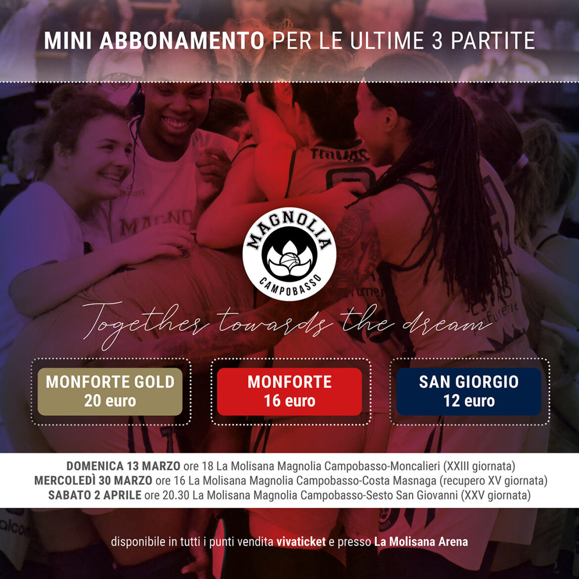 Per quanti vorranno ci sarà la possibilità di acquistare, in un’unica soluzione, i tagliandi per questa sfida, nonché per il match di recupero contro Costa Masnaga (il 30 marzo alle 16) e per l’ultima tra le mura amiche della prima fase della stagione con tre possibili soluzioni (la Monforte Gold a 20 euro, la Monforte a 16 e la San Giorgio a 12).