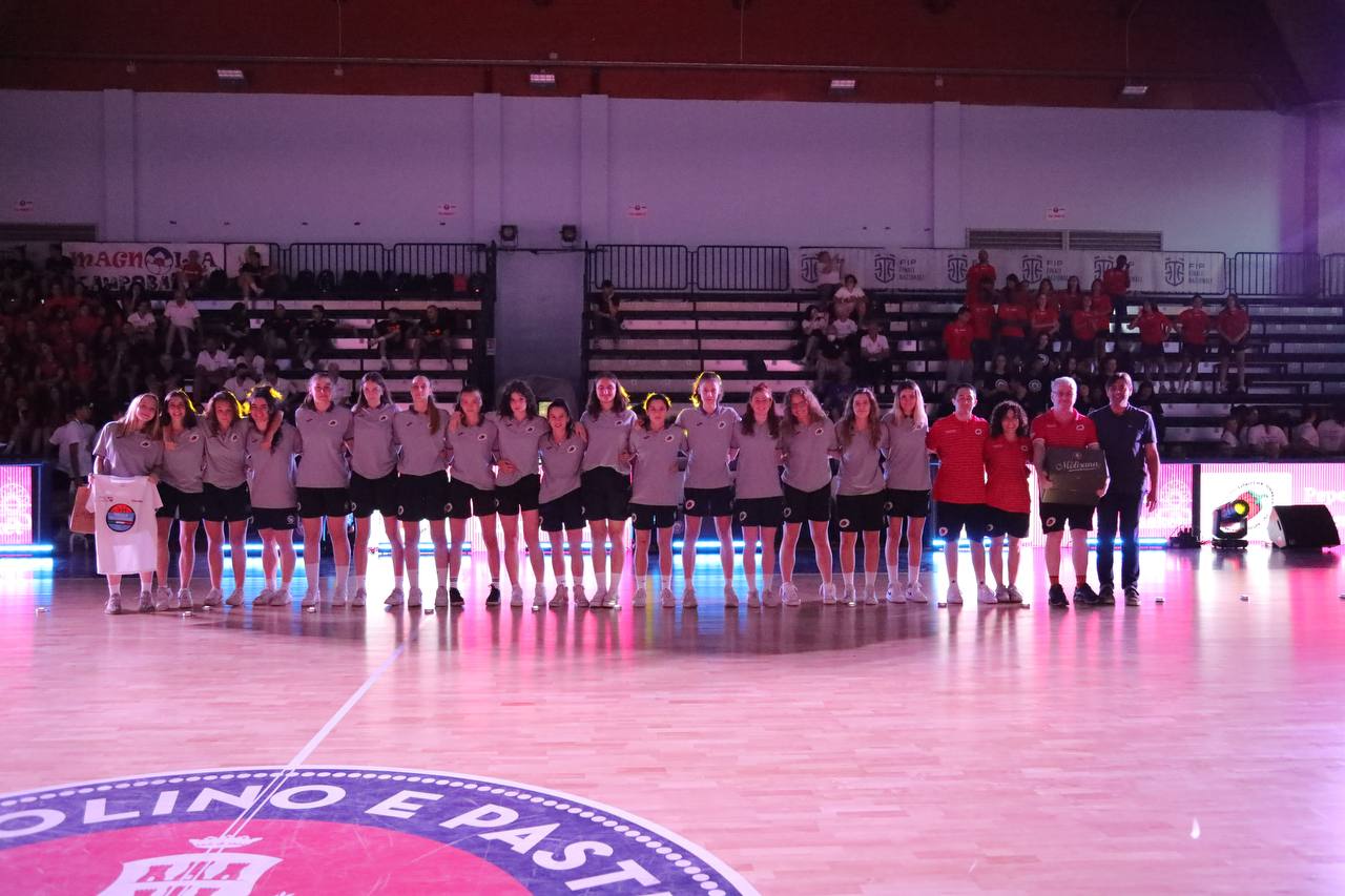 L’esibizione al sassofono contralto di Giuseppe Di Pietro con due cavalli di battaglia della musica dance e le evoluzione delle ginnaste dello Sporting Bovianum hanno trasmesso brividi ed emozioni alle cestiste presenti chiamate a raggiungere il centro del campo per una passerella e per ricevere gli omaggi del comitato organizzatore (con loro anche la ‘diciassettesima squadra’: quella arbitrale).