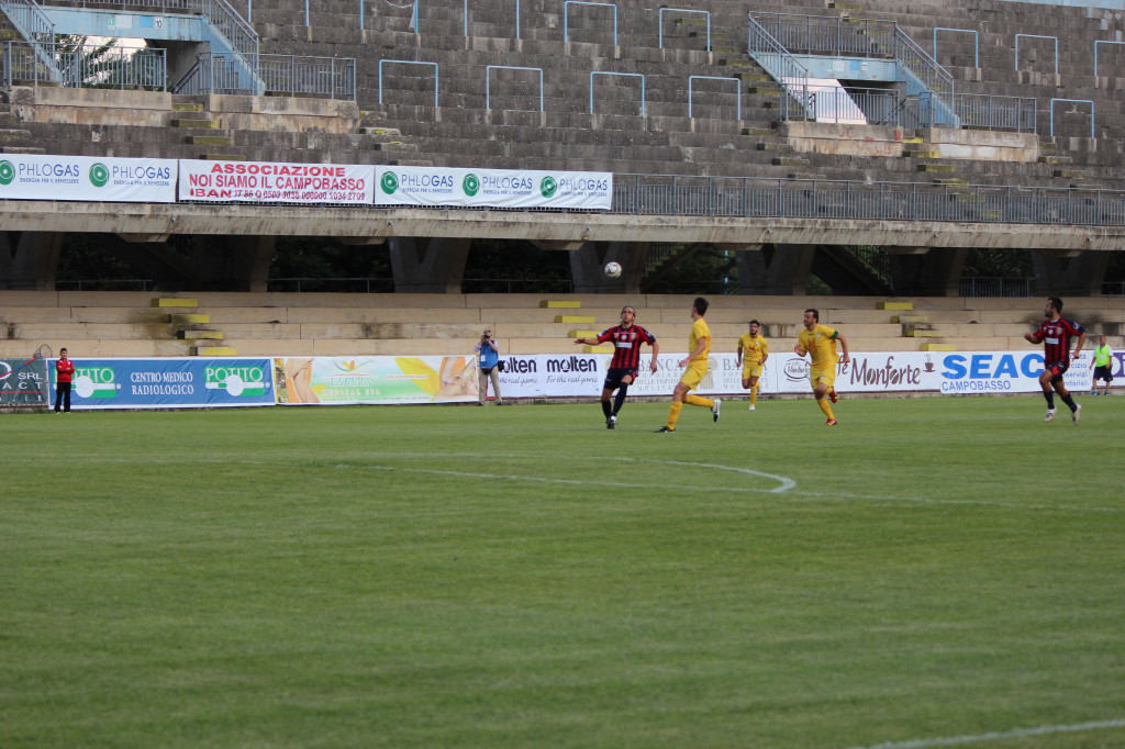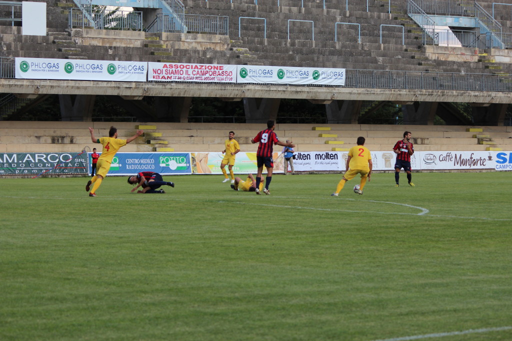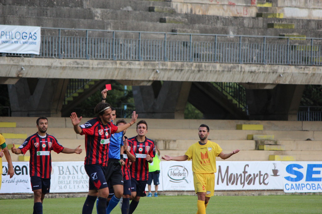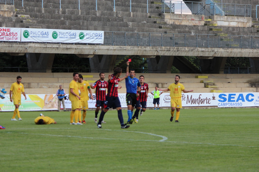 “Il Campobasso ha impiegato tempo a entrare in partita – dichiara il trainer rossoblù Francesco Farina nella conferenza stampa post-gara –. Nel secondo tempo ho visto una squadra che avrebbe voluto vincere a tutti i costi e abbiamo creato cinque nitide occasioni da rete. A condizionare la partita è stata l’invenzione del direttore di gara, che ha espulso Di Gennaro dopo cinque minuti in maniera davvero incredibile. Se sanzioni quell’episodio o estrai il cartellino rosso diretto, oppure lasci giocare, perché Di Gennaro era in protezione di palla e il direttore di gara ha visto una gomitata. Non è stato l’unico errore dell’arbitro, comunque, che in avvio di partita non ha ravvisato un penalty a nostro favore sugli sviluppi di un calcio d’angolo. Così come a Jesi, nessuna televisione l’ha rimarcato, c’era un rigore sacrosanto per il Campobasso. Nel complesso è stata una partita equilibrata e siamo stati bravi nella ripresa, perché nonostante l’uomo in meno non c’è stata partita. Siamo arrivati cinque volte nell’area piccola”.