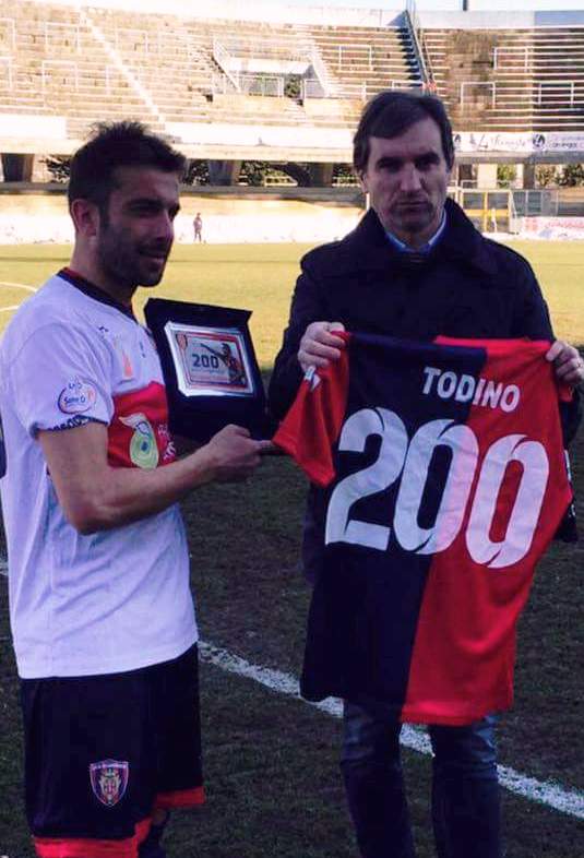 È stato premiato la scorsa domenica 24 gennaio 2016, prima del fischio d’inizio di Campobasso-Jesina, l’attaccante Giuseppe Todino che ha raggiunto le 200 presenze con la maglia rossoblù. Todino arrivò nel 2007 a Campobasso dove rimase per cinque anni. Nel 2014 tornò a vestire i colori rossoblù, dopo essere stato a Matera e Termoli. Sette anni con il Campobasso, 34 reti realizzate, un grande traguardo per un ragazzo che è tra i più longevi a vestire questa casacca, nonostante i diversi cambi di società.